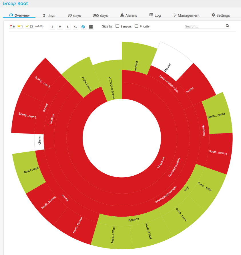 You can adjust the size of the different squares according to the number of sensors that run on a device or in a group, or the sensors' priority, or both. Select the checkboxes in the page header bar to change the square size.