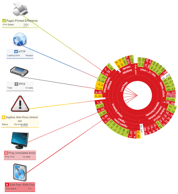 Choose from various icons that represent typical network devices. Icons from this category also display object data. You can see the object name and a sensor overview for the object. This indicates how many sensors show a specific status. For some sensors, a mini graph is shown as well.