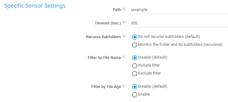 Enter a timeout in seconds. If the scan of the folder takes longer, the sensor cancels the request and shows an error message. If two consecutive scans fail, the sensor shows the Down status. The default value is 300 seconds (5 minutes).