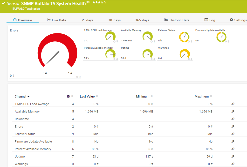 The SNMP Buffalo TS System Health sensor monitors the system health of a Buffalo TeraStation network-attached storage (NAS) via the Simple Network Management Protocol (SNMP).
