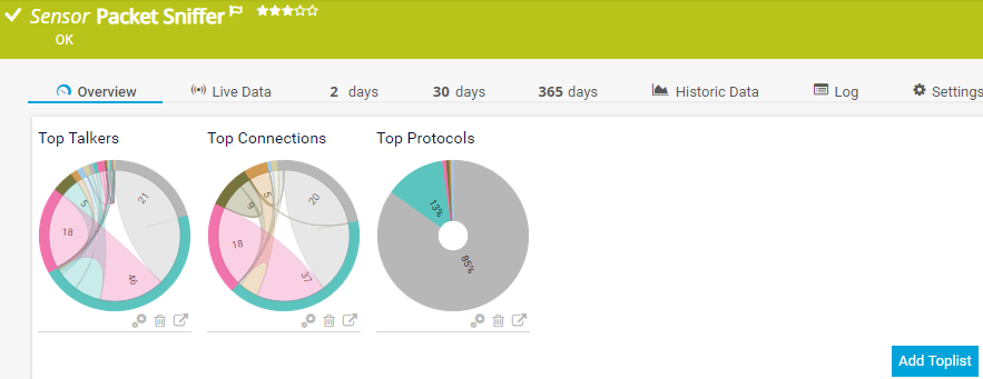 Toplists are only available for Flow and Packet Sniffer sensors. PRTG displays Toplists on the sensor's Overview tab.